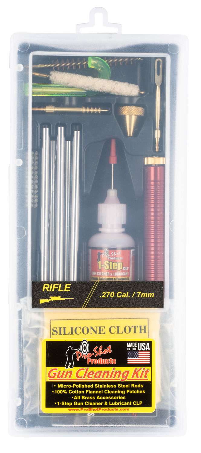 The Classic Box Rifle Kit includes: premium stainless micro-polished gun cleaning rods 32.5-inch length; full size swivel handle; patch holder for 22 Cal & Up; 270 Cal/7mm cotton mop; 270 Cal/7mm brass cleaning jag; brass muzzle guard; next gen 1 step gun cleaner & lubricant; 100% cotton flannel cleaning patches; double ended nylon bristle gun brush; silicone treated gun cloth.