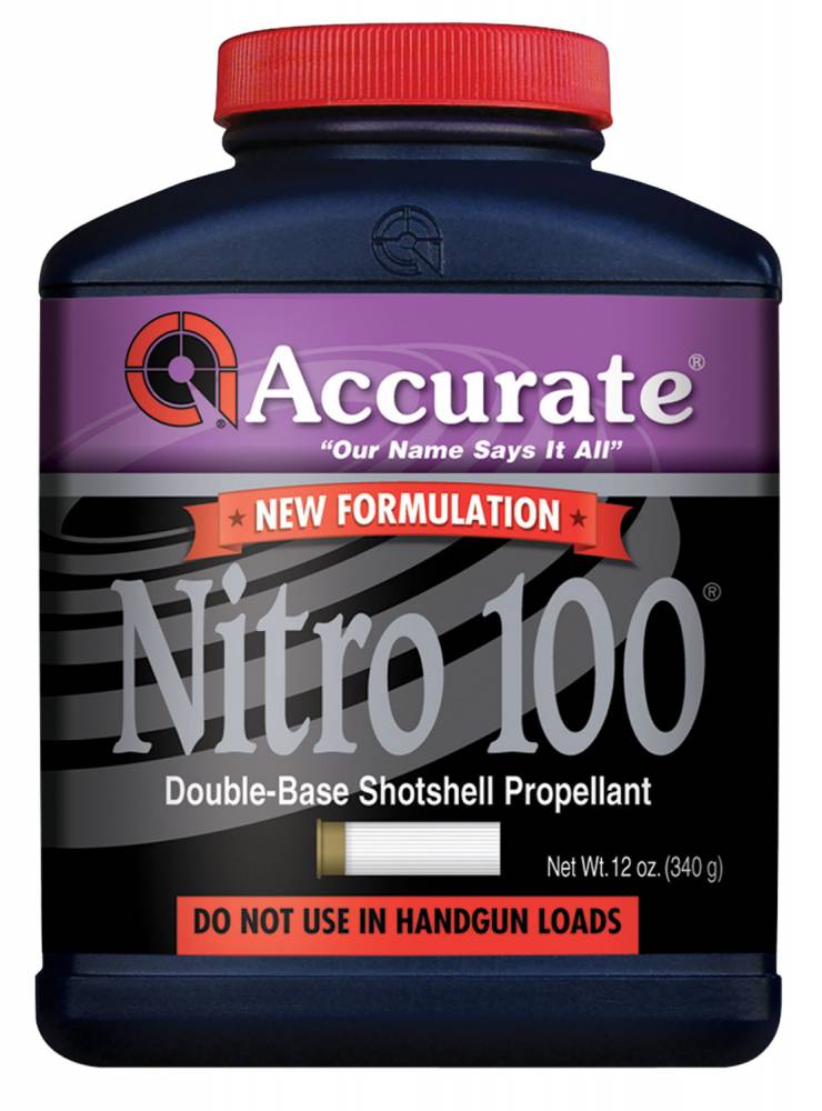 Nitro 100 is a fast-burning, flattened spherical, double-base shotshell powder that is a clean burning, cost-effective choice for all 12 gauge target applications - trap, skeet, light field loads. It's also an excellent choice for low pressure/low loading density applications in handgun cartridges.