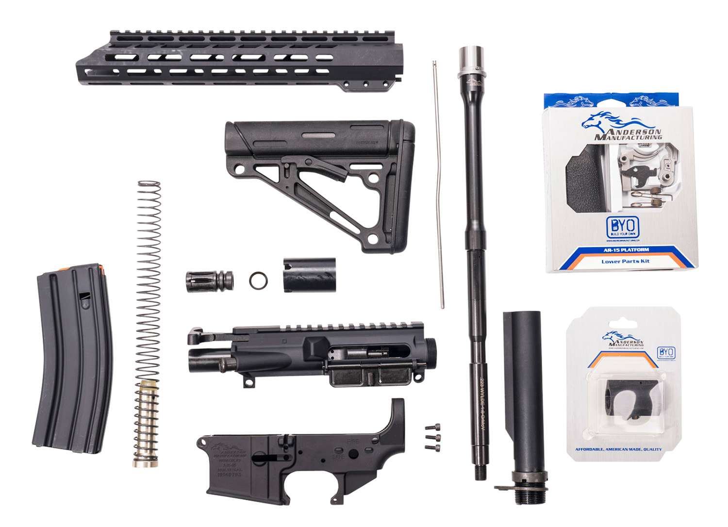 For the first time ever, Anderson Manufacturing is shipping complete Ar-15 build kits. This kit comes with everything you need in order to be able to complete the assembly of the rifle. If you don't feel comfortable, or if you don't have the tools required to finish the assembly yourself it is recommended that you consult a gunsmith. This kit includes a lower receiver which is the serialized portion of the AR-15 platform. As such this kit will require a transfer via an FFL dealer.