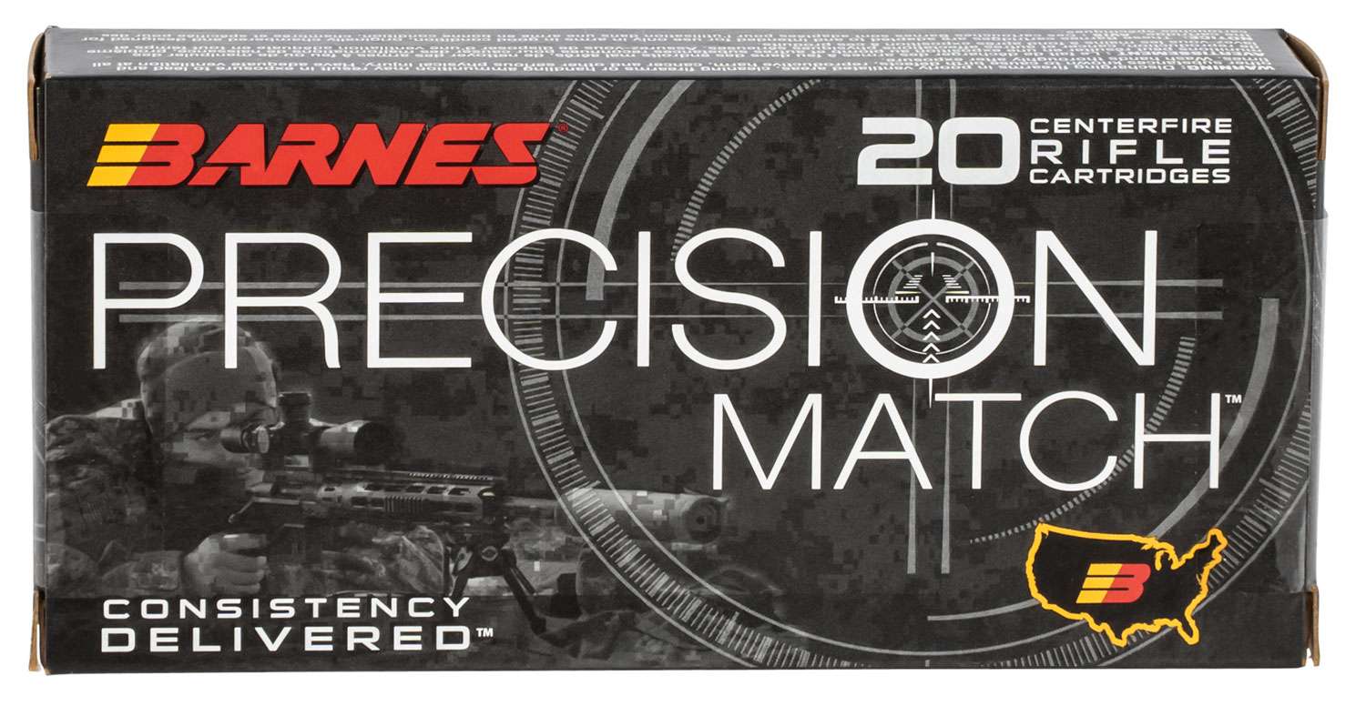 Precision Match, engineered for precision at extreme distances, features exceptionally low standard deviations and extreme variations due to Barnes' exacting manufacturing and quality standards. Precision Match rounds are loaded with a match grade OTM (Open Tip Match) BT projectile featuring a long boat tail and high B.C. As an additional bonus, scan the QR code located on the back of each box to view Doppler radar generated drop tables specific to each load.