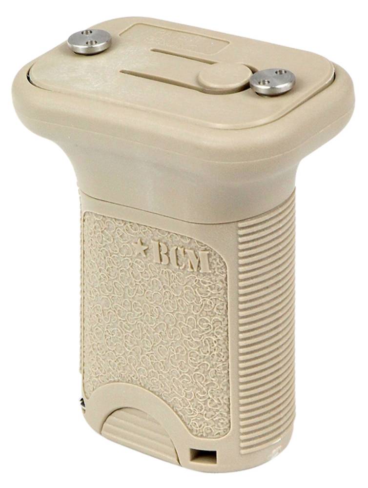 This vertical keymod short grip is a quick detachable, tool-less, with a direct mount KeyMod interface grip. It has a low-profile length for increased mobility and decreased snag factor. The forward angle increases the rigidity of the forearm, while providing a more natural wrist angle. Included is storage inside the grip, a spring-loaded clamps that makes installation and removal easier, and requires three KeyMod attachment hole mounting points.