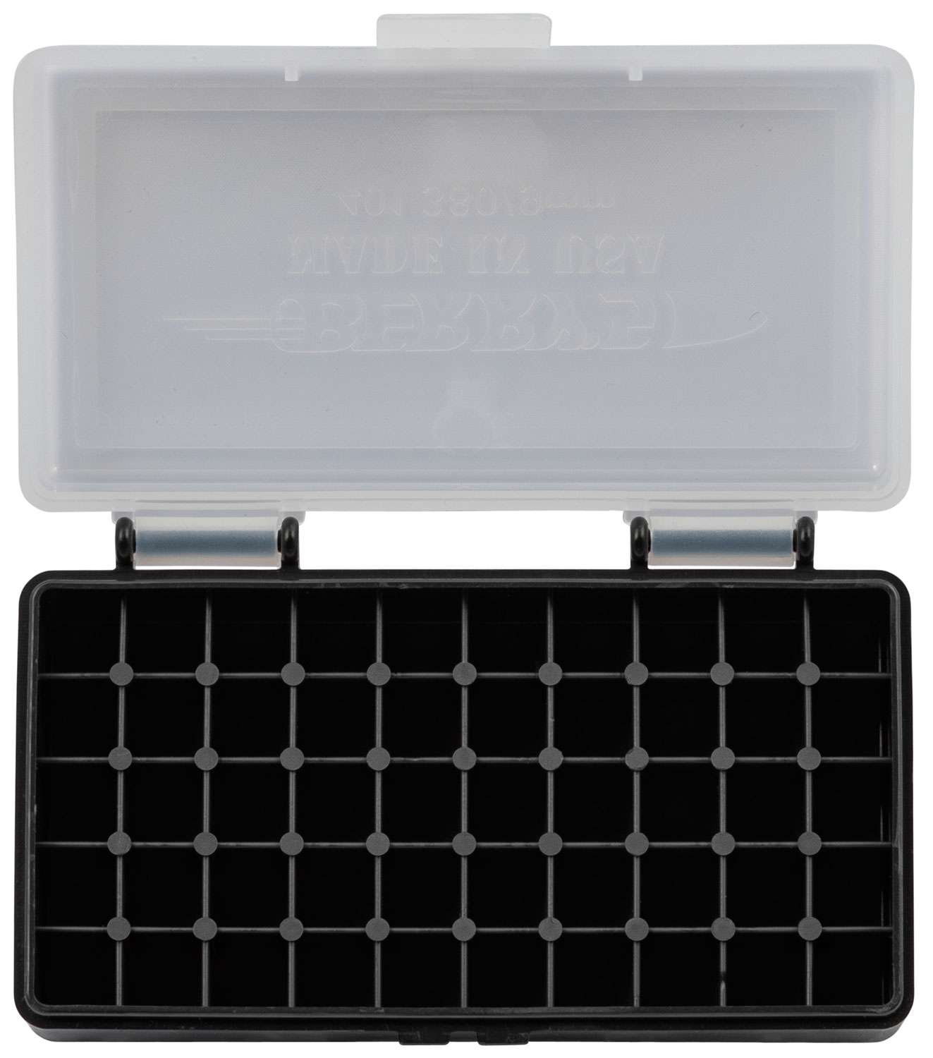 Made in the USA, Berry's 401 50 round box is made from high impact polypropylene for increased strength against cracking, chipping, warping, expansion, or contraction. The box is stack able and features a stronger, flip-top design, allowing the securing of ammo storage with easy one-handed operation.