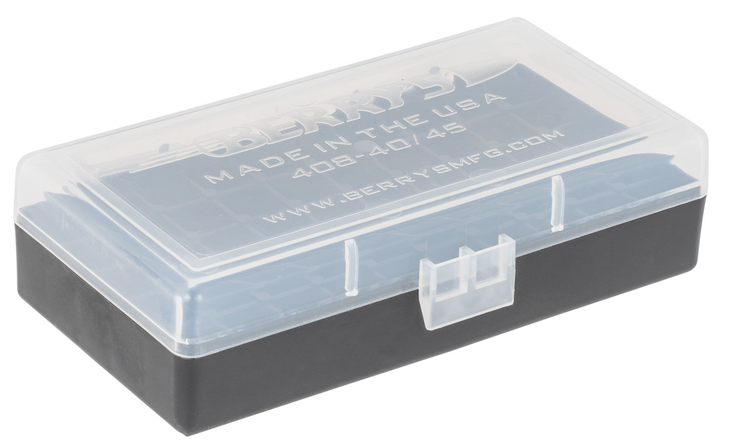 Made in the USA, Berry's 408 50 round box is made from high impact polypropylene for increased strength against cracking, chipping, warping, expansion, or contraction. The box is stack able and features a stronger, flip-top design, allowing the securing of ammo storage with easy one-handed operation.
