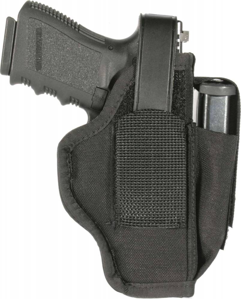 This ambidextrous holster lets you choose how you want to use it on a daily basis. Wear it as a belt holster, on either right or left side, through the unique injection molded belt loops that also act as a cover for the reversible retention strap and thumb break. You can also wear it as an inside-the-pants holster with the spring steel removable clip that secures it to your waistband. Extra strength injection molded belt loops will accept belts up to 1.75" when wearing it in the traditional vertical position. Fits dress belts up to 1.5" when worn horizontally as a middle of the back holster. Adjustable pouch mounted to the front of the holster lets you keep a spare magazine or illumination tool with the gun.