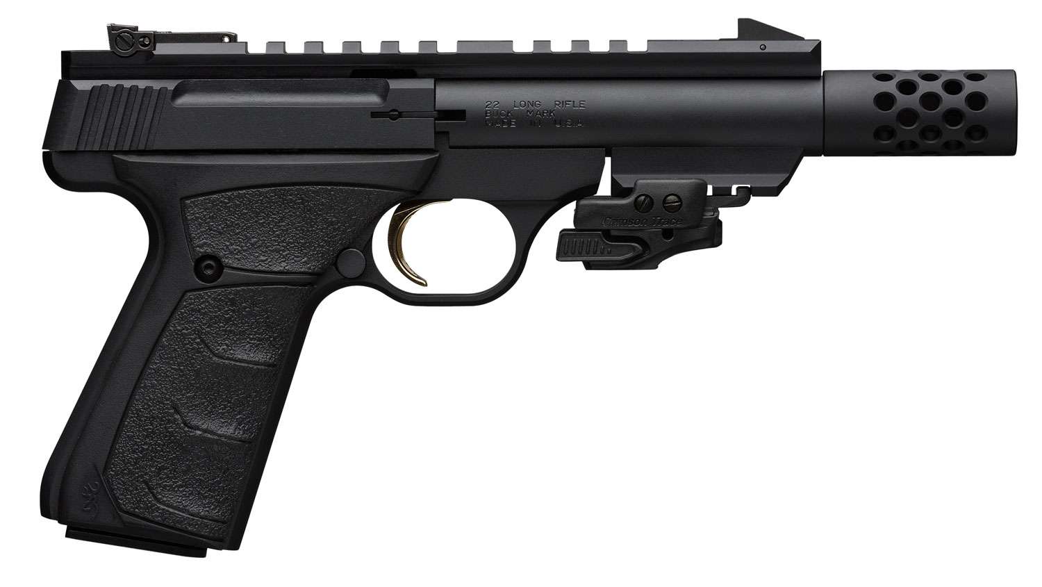 The Browning Buck Mark Black Label Suppressor Ready Laser straight blowback design offers simplicity and reliabilty. Every Buck Mark starts out as a solid piece of aircraft-grade 7075 aluminum alloy, and then is CNC machined to exacting tolerances. The crisp single-action trigger, hand reamed chamber, target crowned barrel and finely adjustable Pro Target sights mean the Buck Mark comes ready for fun straight from the box. The UFX overmolded grip textured surfaces are comfortable and secure in any condition, while the narrow profile makes them perfect for all hand sizes. Features a gold plated trigger, Crimson Trace laser on under barrel Picatinny rail and muzzle brake. Included is a pistol rug and two magazines.