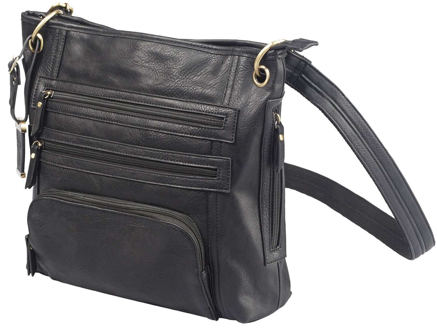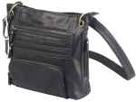 Bulldog's Cross body style purse is designed to fit most small autos and revolvers. It features an universal fit, color matched holster and is made from durable leather. The two separate zippered main compartments features multiple inner compartments which are fully lined, while the one external compartment is for small accessories. This large cross body purse dimensions are 14"x 12" x 3" and has a black finish.