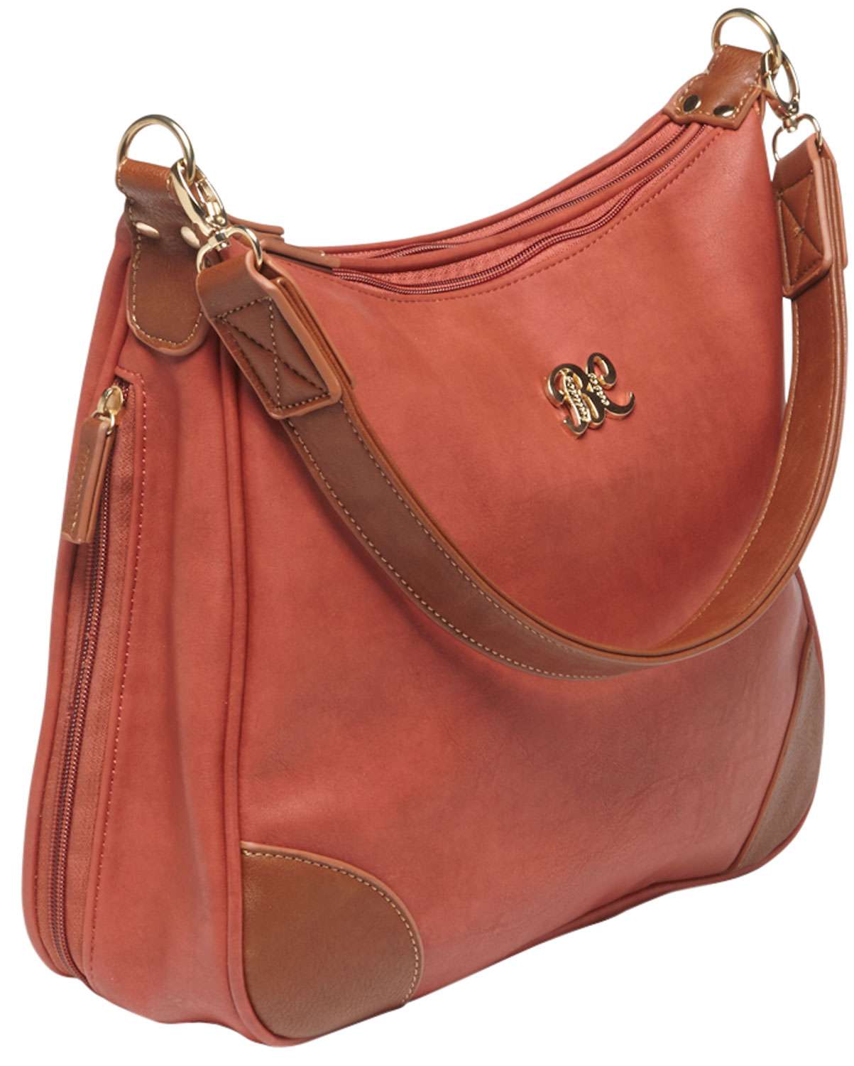 Designed for left or right handed use, the Hobo style purse is made of attractive durable leather. It has a color matched holster made to fit most small autos and revolvers. The two separate zippered main compartments are fully lined and there is an external zippered accessory pocket. The slash-resistant shoulder strap will reinforce the ability for the purse to remain in possession if a theft were attempted. The purse's exterior dimensions are 13" x 10.5" x 3.5".