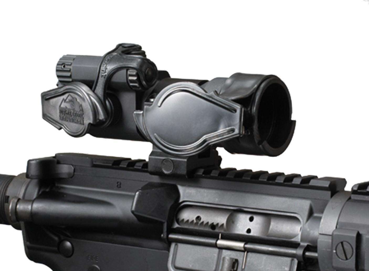 Butler Creek's SideWinder is a unique cover that can be used in zero tolerance configurations. Instead of flipping forward, the SideWinder's Dual Axis Zero Clearance design rotates up to the side and folds back out of the way providing 100 percent unobstructed viewing.