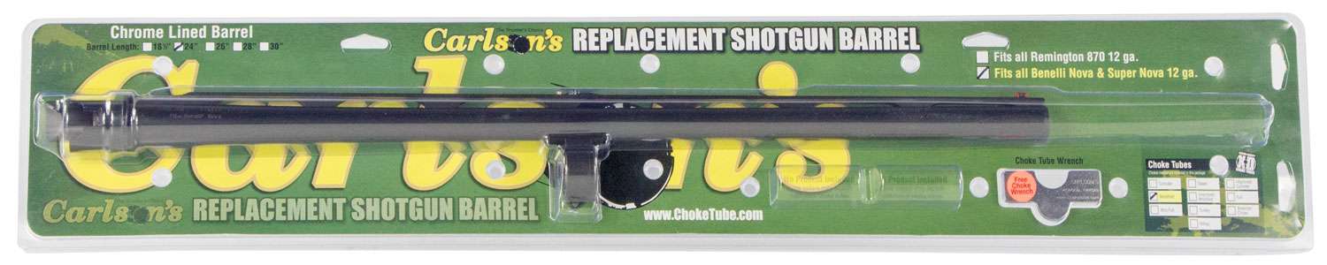 Carlson's high quality accessory shotgun barrels are made for Benelli SuperNova and Nova models. All barrels are constructed from certified ordinance grade 4140 steel with chrome lined bores. Vent rib models have a satin matte blue finish with red fluorescent front sight and brass center bead. Barrels come with a Carlson choke tube, manufactured from 17-4 stainless steel except for the rifled choke tube models which are made from 304 high stress stainless steel, installed. All of our Benelli replacement barrels are threaded for the Benelli Mobil choke style system. *Note- For Benelli Nova & Super Nova, 12 gauge only, right hand only.