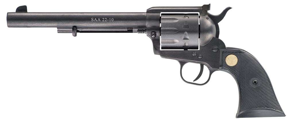 A 10-shot version of the classic Single Action in caliber .22LR. Three barrel lengths are available (4 3/4", 5 1/2", 7 1/2"). Sights are fixed except on the 7 1/2" barrel model. One of the most accurate reproductions of the 1873 Single Action. While maintaining the true to form classic design, this Single Action revolver is a hybrid of modern technology and manufacturing with the feel of the Old West. This revolver is crafted with a steel rifled barrel, with most of the mechanism and components constructed from a special formulated alloy that offers greater ductility and flexibility assuring long lasting reliability and durability.