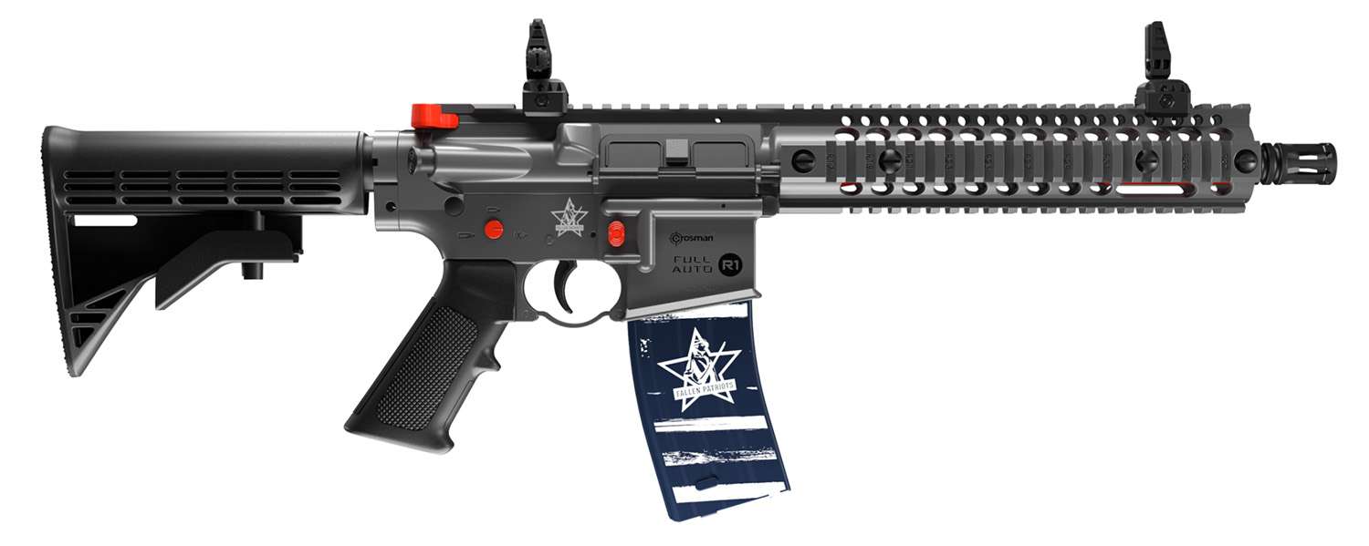 This limited edition Crosman Full Auto R1 pays tribute to the Children of Fallen Patriots Foundation. Crosman will give a portion of the proceeds to this foundation. This BB air rifle is fueled by two 12-gram CO2 cartridges and a 25 round drop-out magazine, you will have target cans flying in no time. Outfitted with a stealth gray stock and color highlights that red metal component and custom dark blue magazine for an exciting and patriotic look. The rifle features a genuine feel, familiar controls, and an intense 1400 round per minute rate of fire, all at a jaw-dropping rate of up to 430 fps. Even better, the rifle is fully customizable with a 6 position adjustable stock, AR-compatible buttstock/pistol grip, a Picatinny rail that provides endless accessory mounting opportunities and a bonus CFPF branded morale patch.