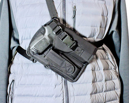 The Yukon Hunting Rig is made of heavy duty ballistic nylon with a fully adjustable harness the can be adjusted for multiple angles. The large auto model comes with an adjustable magazine pouch. The holster also features a quick release buckle strap to keep your firearm secure.