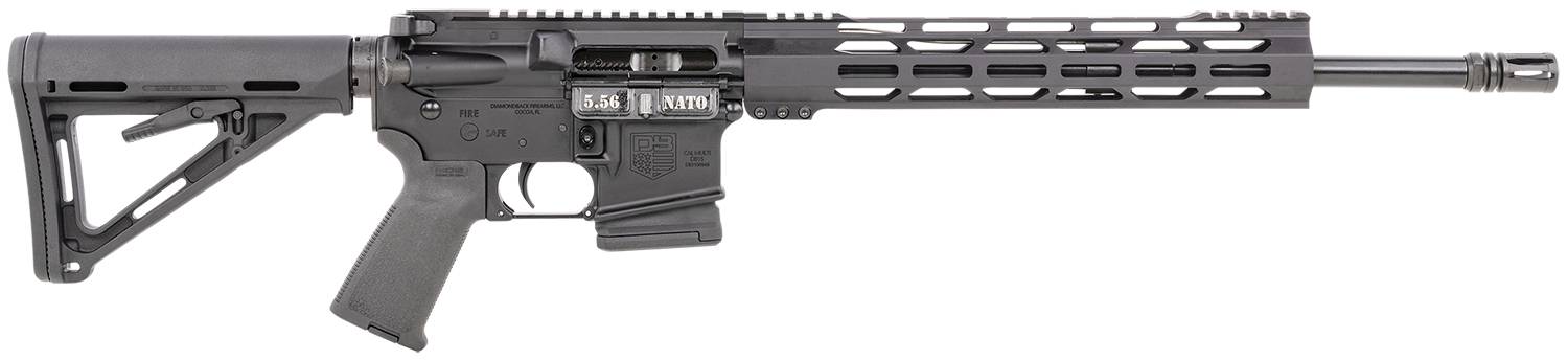 The Diamondback is a carbine rifle that features an A3 flattop forged 7075 T-6 aluminum receiver with a black anodized hardcoat finish; 12" aluminum M-LOK rail; black nitride Chrome-Moly, free float, medium barrel and an Azimuth 5.56 sporter model bolt carrier group. Includes a 10rd Magpul magazine.