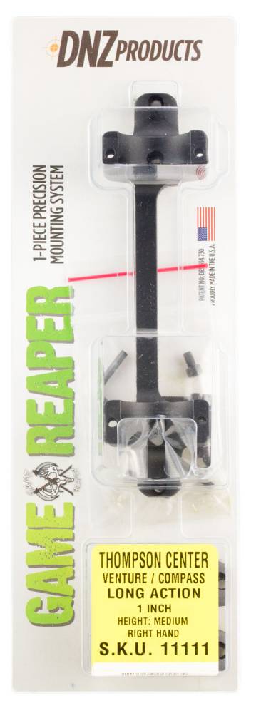 DNZ's Game Reaper is precision machined from a solid block of top-grade billet aluminum, and is custom made to fit each type of firearm and align perfectly with your rifle receiver with no moving parts between the firearm and the scope. The Game Reaper absorbs shock and withstands temperature extremes better than steel mounts. It is 67 percent lighter than comparable one-piece mounts with four times the threads and precision socket-head cap screws for absolute strength and security. Fits T/C Venture & Compass, long action.