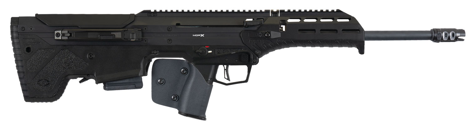 The MDRX (Micro Dynamic Rifle Xtreme) is designed for maximum concealment and ambidexterity, allowing operators to return fire at any angle without exposing unnecessary parts of their body to threats. It features upgraded polymer resin to better withstand high impact falls, and improved gas block drainage to ensure maximum reliable performance in water and mud submersion testing. The trigger pull and creep have been reduced to allow for more accurate shooting capability. The compliant rifle qualifies as a featureless rifle with 20" barrel, Desert Tech's Ratchet compensator, a 10 round magazine, and a shark fin that is attached to the grip of the rifle.