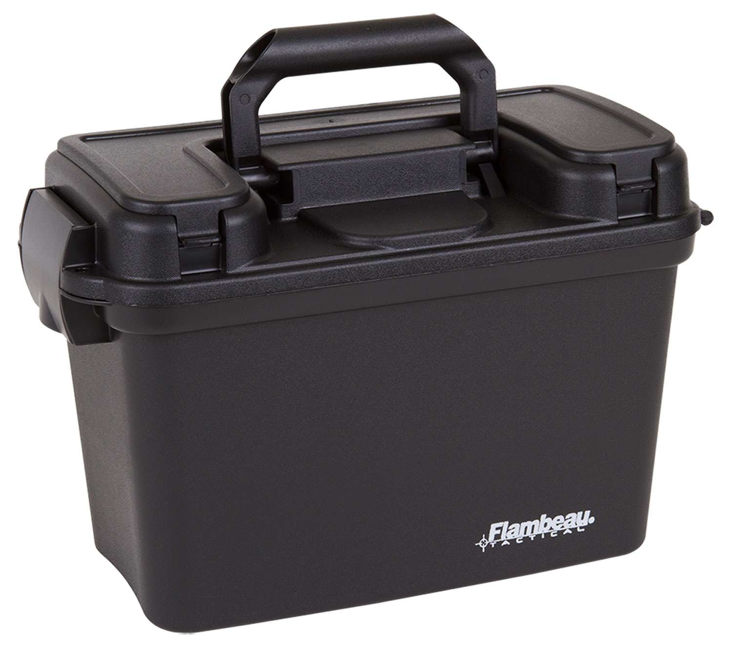 The Tactical Dry Box is made in the U.S.A.. It features a durable polymer construction with a removable tray, flip-top accessory storage compartment, water-resistant gasket, OTC latch, and carry handle. This 14" model has a black finish.