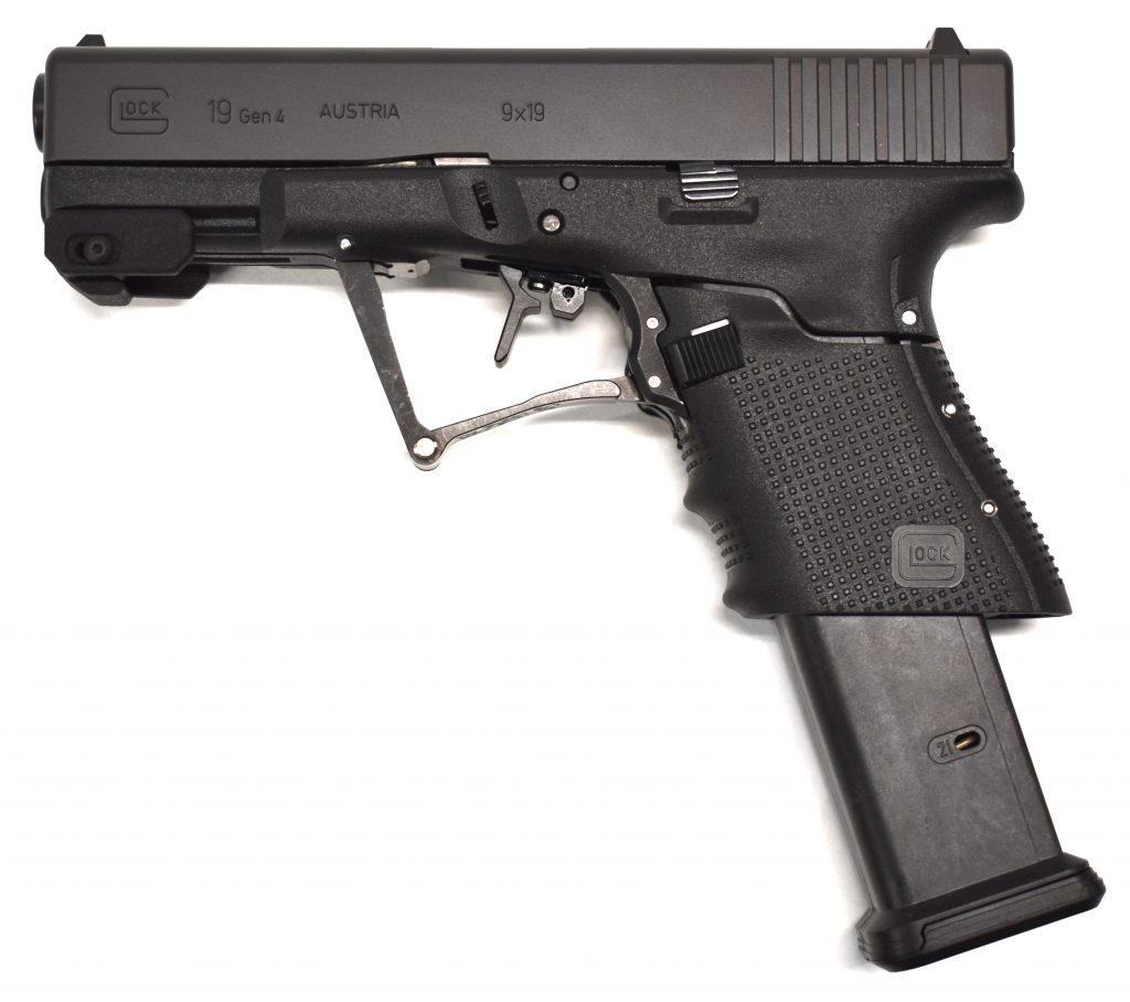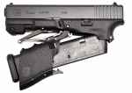 Full Conceal takes a Glock 19 and creates this extremely concealed carry friendly firearm. This firearm folds in half at the trigger guard to give the footprint of a cellphone. It gives the carrier the ability to carry small but not forfeit a full-sized grip. The safety has been enhanced making it inoperable while folded. It holds 22 rounds thanks to the extended magazine.