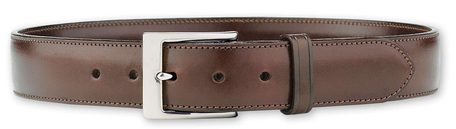 Galco's SB3 Dress Belt is 1.5" inch wide, with both top and lining made of premium saddle leather, this is a dress belt designed to carry the weight of a handgun. It has a nickel plated solid brass buckle and is sized measuring to the center hole in the belt.