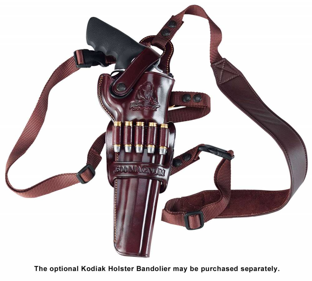 Designed to keep a large hunting handgun both comfortable and accessible, Galco's Kodiak Shoulder Holster carries a magnum revolver diagonally across the torso. Using the same principles as modern backpacks, it has a padded shoulder strap used in conjunction with a torso strap that allows for instant adjustments throughout a day spent afield. As the torso strap is tightened, weight is shifted off the shoulder strap, allowing for a full day of comfortable field carry. The Kodiak comes assembled and includes holster, shoulder strap and torso strap. It has a Havana Brown leather finish.