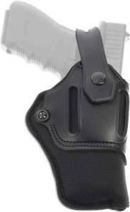 The main body of the holster is constructed of layered synthetics, beginning with an outer layer of durable black ballistic nylon. Beneath that is closed cell foam that imparts stiffness and sturdiness to the holster body. Finally, a layer of 420 denier gunmetal-colored packcloth lines the holster. An ambidextrous exoskeleton made of top grain steer hide allows the belt to be threaded through either side of the holster body in strongside or crossdraw positions, for right or left-hand draw. The safety strap has a hammer slot and is reversible for ambidextrous use.