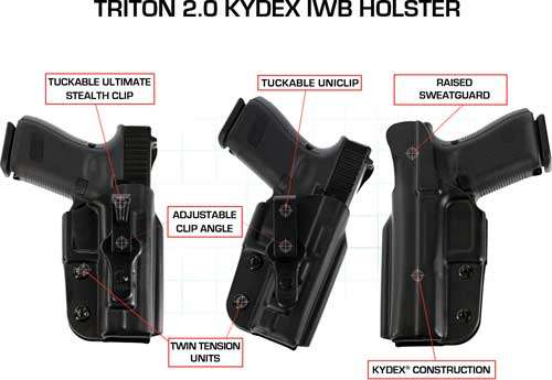 Constructed of durable, virtually maintenance-free Kydex, the Triton 2.0 is fast on the draw, slender in profile, and easy to conceal. The firm holster body allows a smooth and easy return to the holster after the draw, while the raised sweat guard protects the pistol from corrosive perspiration and also protects the wearers skin from hard steel. This model has a black finish and is compatible with: Colt 1911 4.25"; Kimber 1911 4"; Para USA 4.25" Single Stack Mag, 4.25" with Staggered Mag; S&W SW1911SC 4.25"; Sig-Sauer 1911 4.25" (contoured slide); Springfield 1911 4".