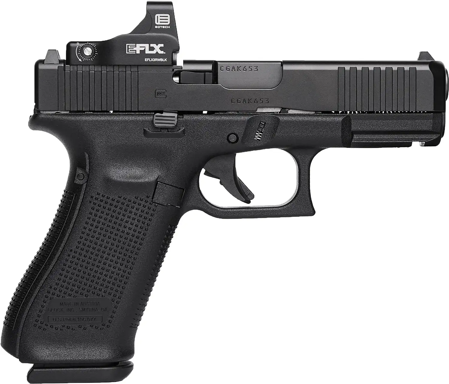 The Glock 45 Gen5 MOS Crossover combines a compact slide with a full size frame. Gen5 features flared mag-well has a larger funnel; Glock Marksman Barrel (GMB) more aggressive polygonal rifling with a target-style crown and tighter chamber specs; ambidextrous slide stop levers offer increased ergonomics for left-hand shooters and shooting with the support hand; removal of finger grooves; Safe Action System, safeties disengage sequentially as the trigger is pulled and automatically re-engage when the trigger is released; enlarged floor plate makes it easier to pull the magazine free of the pistol and customizable frame size with backstraps in two sizes with beavertail. The multiple backstrap frame allows the users to change the circumference of the grip to fit their individual hand size. MOS features a slide that is precision machined to provide a mounting system for popular optic sights. With multiple adapter plates (sold separately), you can quickly and easily mount miniature red dot sights. Includes EoTech 3 MOA Mini Reflex sight, one adapter plate, three magazines, mag loader, cleaning kit, pistol case and gun lock.