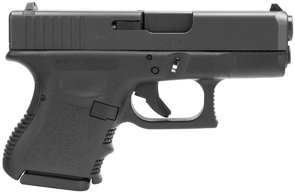 The Glock 27 is small, light, accurate, and powerful. The grip has a built-in beaver tail design which allows the shooter to acquire a high and tight grip for the best control. The rear serrations and the aggressive texture of the grip lets the shooter more easily operate the pistol. This model is CA Compliant.