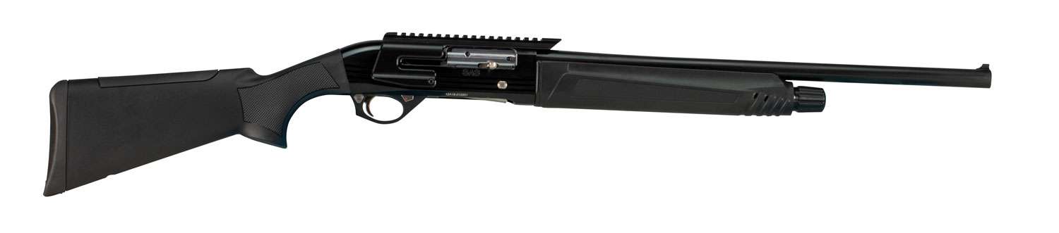 This firearm features a synthetic stock, black metal finish, and a cross-bolt safety.