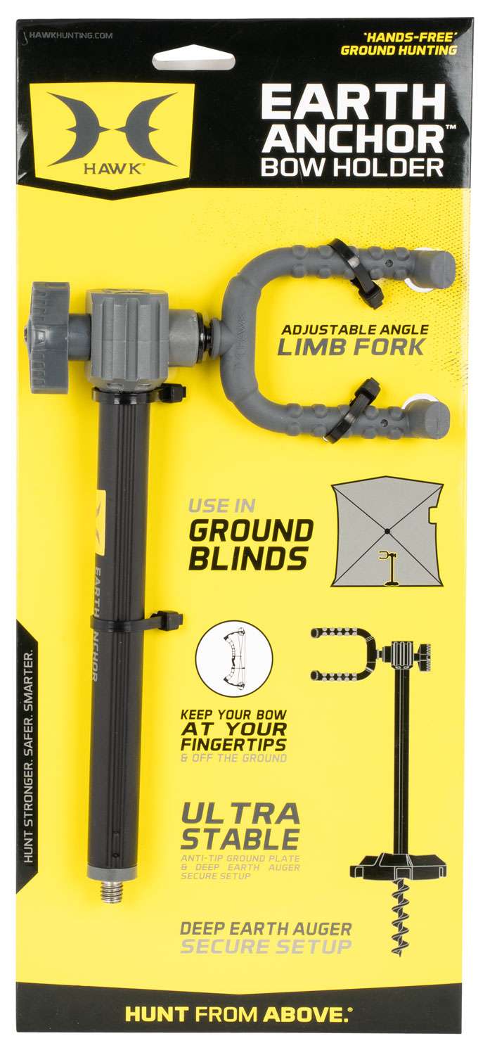 The portable Earth Anchor Bow Holder allows you to position your bow at your fingertips while you sit on the ground hands-free. It quickly digs into the ground with a 6" Deep Earth Auger. Combined with a rugged ground plate, this bow holder is ultra stable & secure. The bow holder is designed to work with most bows and perfect for hunting from a ground blind or shooting in the backyard. A Premium Silent-Grip Limb Fork adjusts 360 degrees and locks securely with geared teeth at the perfect angle for grabbing your bow when needed.