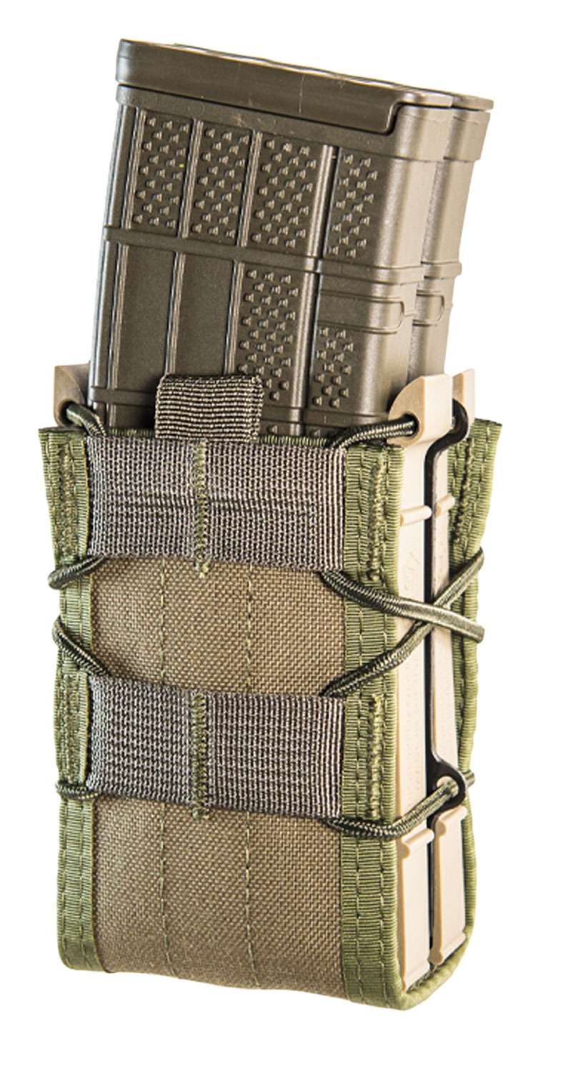 This line of polymer TACOs function much the same as their nylon counterparts. The body and brackets are made with a durable and flexible, proprietary polymer and are laced together with a bungee cord. As with the originals, these pouches grip and retain a wide variety of magazine styles and calibers. It mounts to both MOLLE and belts up to 2" with High Speed Gear's universal HSGI Clips, has a pop lock configuration that orients excess bungee down and out of the way, and features grommets for drainage.