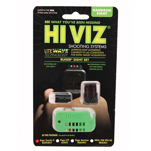 Hi-Viz Interchangeable Front and Rear Sight Set for Ruger Security 9. Front sight includes Green, Red and Black replaceable LitePipes RGS9LW21
