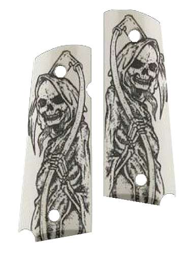 This model has a Grim Reaper etching and is compatible with 1911 Government with ambidextrous safety.