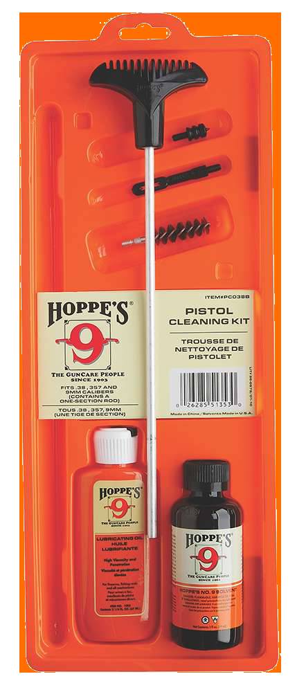 Hoppe's Pistol Cleaning Kit is convenient, and well thought out. The kit includes Hoppe's No. 9 Solvent 2 oz., lubricating oil 2.25 oz., round cotton patches, slotted ends and adapters (where appropriate), and an aluminum cleaning rod. Brushes are not included. It comes in an economical clamshell package. This model is compatible with all pistol calibers.