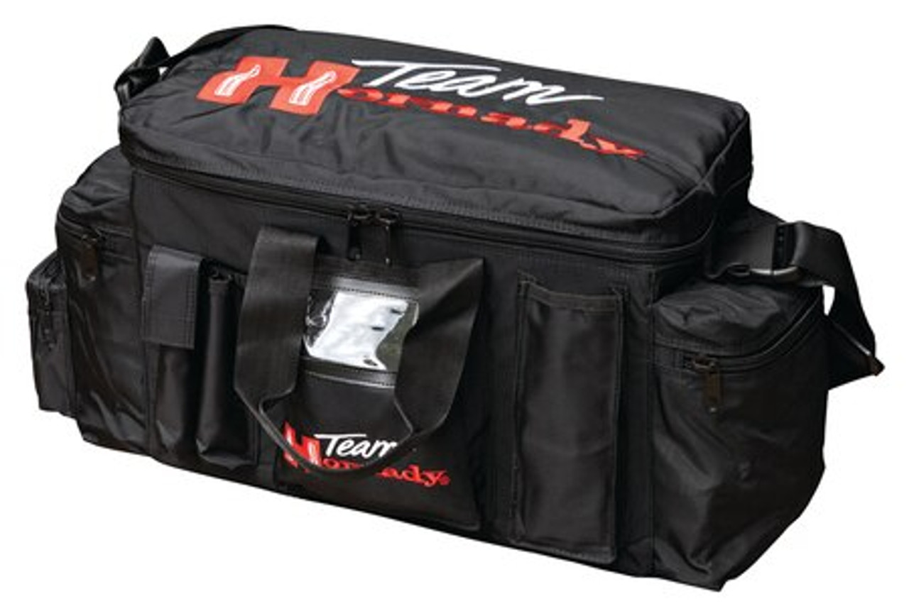 This durable nylon range bag has large compartments for the range shooter or uniformed officer. With embroidered Team Hornady logos, this range bag can carry a variety of accessories. Carry your guns, ammunition and accessories in this multi-pocketed Team Hornady range bag.