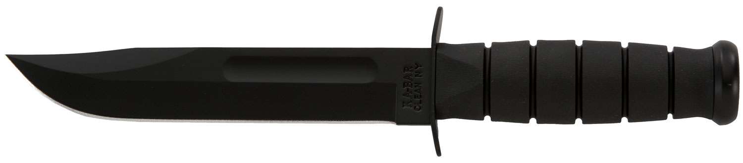 Ka-Bar's full-size Fighting/Utility knife with a black blade and black Kraton G handle. The clip point blade is a classic shape and very practical. The shape seems to have a portion of the spine of the blade clipped off which brings the blade point lower for extra control and enhances the sharpness of the tip. It provides ample "belly" in the blade for slicing or skinning and a good tip for inserting in and under things that need to be cut. You will often find a false edge with the clip point. This knife is easy to sharpen, plain carbon steel used in knife making. It's proven to be one of the most popular steels used in Ka-Bar knives. It available with a plain or partially serrated edge.