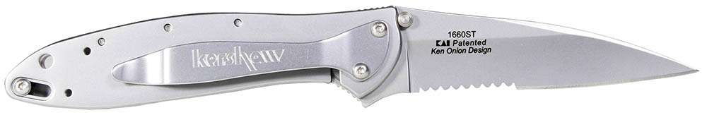 Kershaw's serrated Leek offers Ken Onion's distinctive design as well as the SpeedSafe ambidextrous assisted opening system. With SpeedSafe, the user can smoothly and easily deploy the 3" Sandvik 14C28N steel blade with one hand, either left or right. The blade is a modified drop-point, making it a great slicing knife, while the slim tip gives it piercing capability and the ability to do detailed work. Made in the USA.