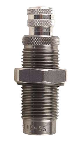 A carbide sizer die sizes the cartridge while it is being crimped. The adjusting screw quickly and easily sets the desired amount of crimp. Revolver dies roll crimp. A perfect taper crimp is applied to autoloader rounds.