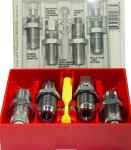 Lee's Pistol 4-Die Set includes Carbide Full Length Sizing Die, Bullet Seating Die, Powder Thru Expanding Die, Carbide Factory Crimp Die, Universal Shell Holder, Powder Dipper and instructions/load data.