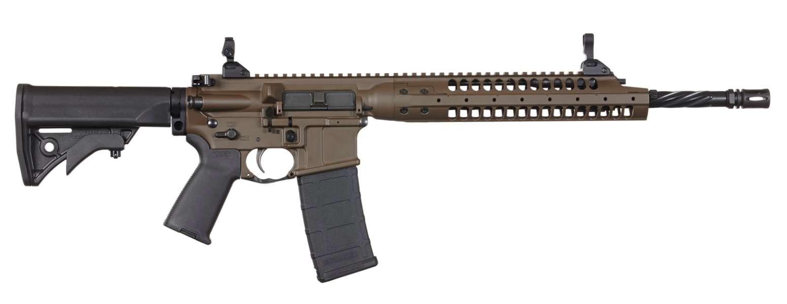 LWRC's IC-A5 is built for high performance and is constructed using the highest quality materials. It is designed with a low profile, 2-position adjustable gas block allowing the shooter to compensate for running a suppressor with the added benefit of a longer modular rail system. The upper rail section is a special cutback version, which allows the use of the low profile gas block and at the same time keep the full 12" modular rails available on the sides and bottom of the hand guards. Its dual control fully ambidextrous lower receiver includes bolt catch and release, magazine release and fire control access from both sides. The cold hammer-forged barrel is NiCorr treated and spiral fluted, while the Nickel-boron coated bolt carrier delivers unparalleled wear resistance, corrosion resistance and permanent lubricity. The IC-A5 comes complete with, LWRCI Skirmish back-up iron sights, an ambidextrous charging handle, LWRCI adjustable compact stock, a Magpul MOE+ grip, and A2 Birdcage flash hider. This model has a 16.1" barrel and a Patriot brown metal finish.