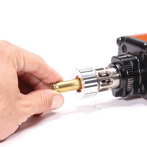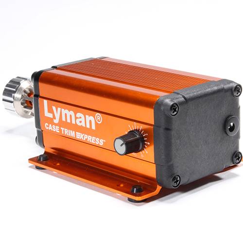 Lyman's Case Trim Xpress gives rifle reloaders the speed and accuracy that they have been looking for when trimming cases. The unit has its own power source, and a strong variable speed motor, so there is no need to use power drills or pur- chase separate motors. By using bushings that contact on the shoulder of bottle neck type cases, the Case Trim Xpress will quickly and cleanly trim your brass by simply pushing the case against the long lasting carbide cutter. It comes with a set of 10 bushings (in orange type below) designed to fit most popular bot- tleneck rifle cases. The bushings support and center the case with the cutter. No pilots are needed. The bushings are spring loaded to provide a smooth, effortless cut; and allow the user to trim approximately 15 cases per minute. In addition, the Case Trim Xpress is equipped with an adjustment wheel, which allows case lengths to easily be "dialed in" to .001" increments. Plus the Case Trim Xpress is made with a compact, low profile housing that doesn't eat up all of your bench space.