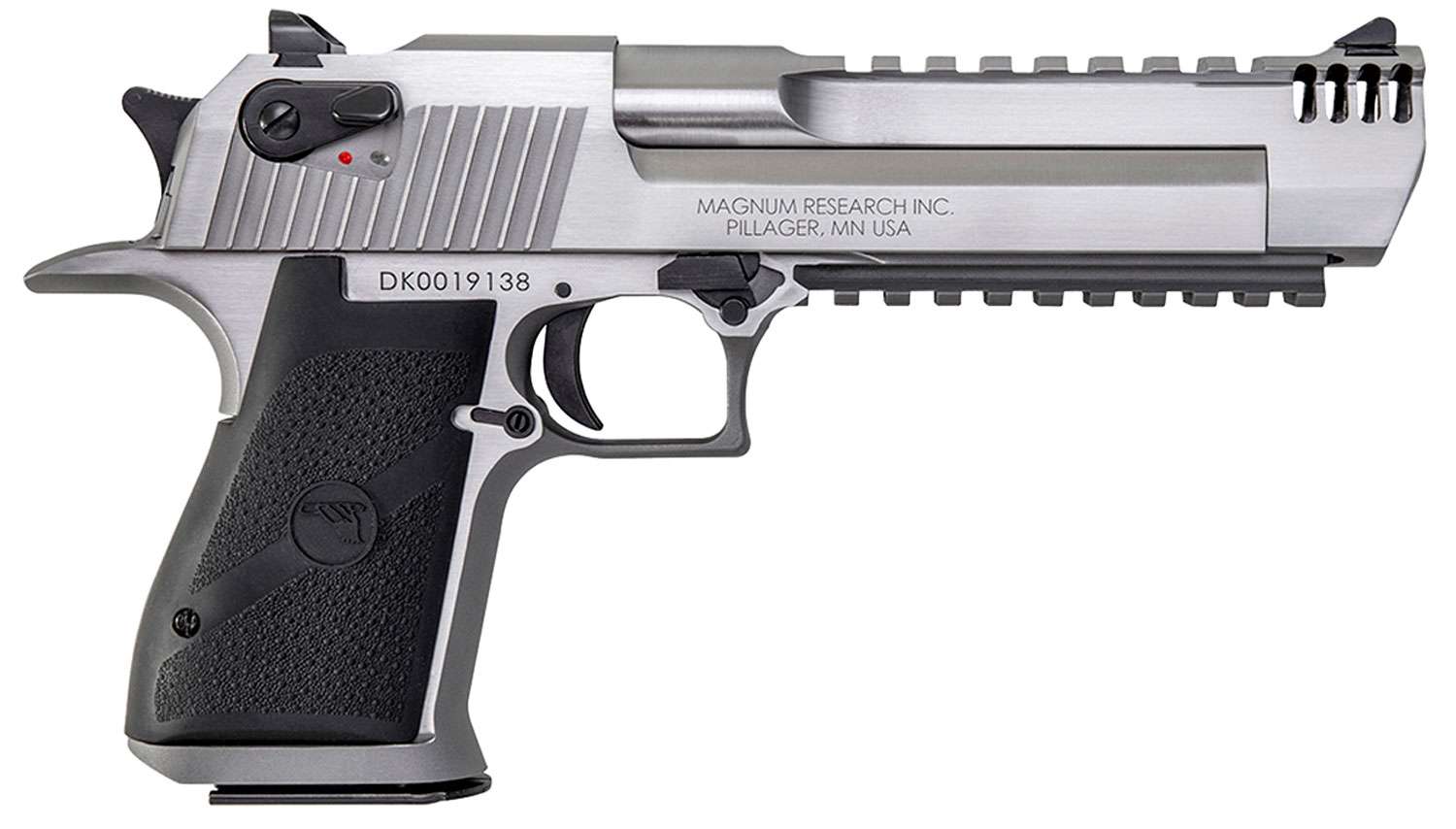 The Desert Eagle is an icon and the Mark XIX Desert Eagle pistol is no exception. It's gas operated, meaning even though this firearm is large and in charge, it won't feel like it. While customizable, it is a stainless steel barrel, slide, and frame and offers a beautiful shine. It features a full Weaver rail on top of the slide, a Picatinny rail on the bottom, a muzzle brake, and standard ambidextrous safeties on the slide. This firearm is a work of art as much as it is functional.