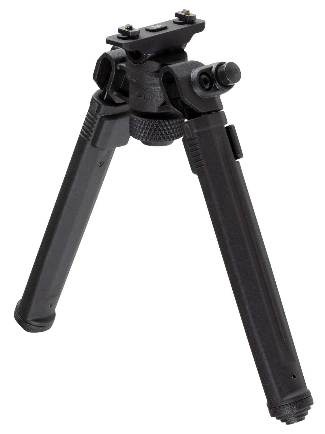 The Magpul bipod is constructed of Mil-spec hard anodized 6061 T-6 aluminum, stainless steel internals, and injection-molded reinforced polymer. Deploying and adjusting it is quick and easy. Spring-tensioned legs stow neatly forward and snap down and lock into place with one hand. The legs extend a full four inches, from 6.3" to 10.3". It can tilt up to 50 degrees and pan up to 40 degrees. Additionally, the Magpul Bipod has the exclusive ability to lock pan at 0 degrees while maintaining full tilt functionality. A soft rubber bipod locking knob cap is attached to the locking knob gives users a steady, non-marring forward rest while the bipod is folded. Should users choose to change feet, the Magpul Bipods legs accept most Atlas pattern bipod replaceable feet, except for the Atlas 5-H style.