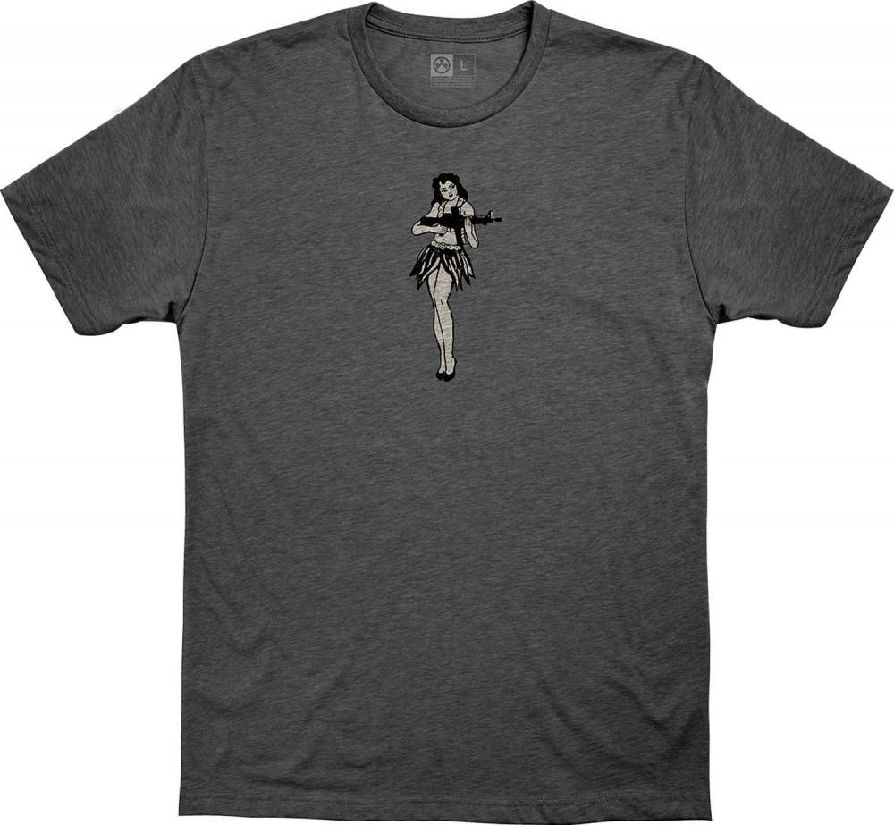 Made in the USA, the Magpul Hula Girl t-shirt is made of 60% cotton/40% polyester with a crew neck and set-in sleeves. It features a tag-less interior neck label, shoulder to shoulder neck tape, and double-needle stitching.