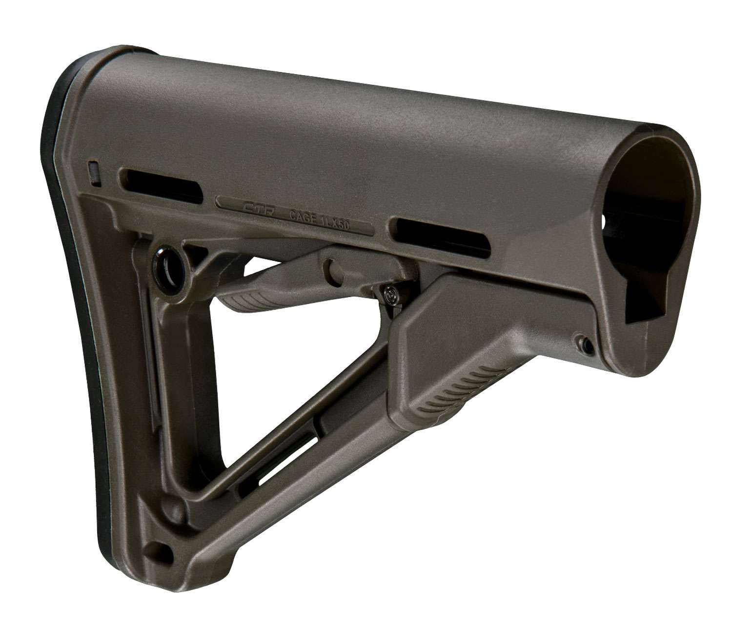 The Magpul CTR (Compact/Type Restricted) Mil-Spec Model is a drop-in replacement buttstock for AR15/M16 carbines using mil-spec sized receiver extension tubes. Designed for light, fast action the streamlined A-frame profile avoids snagging and shields the release latch to prevent accidental activation. The Mil-Spec Model includes a standard 0.30" thick rubber butt-pad which provides positive shoulder purchase to prevent slippage even with body armor or modular gear.