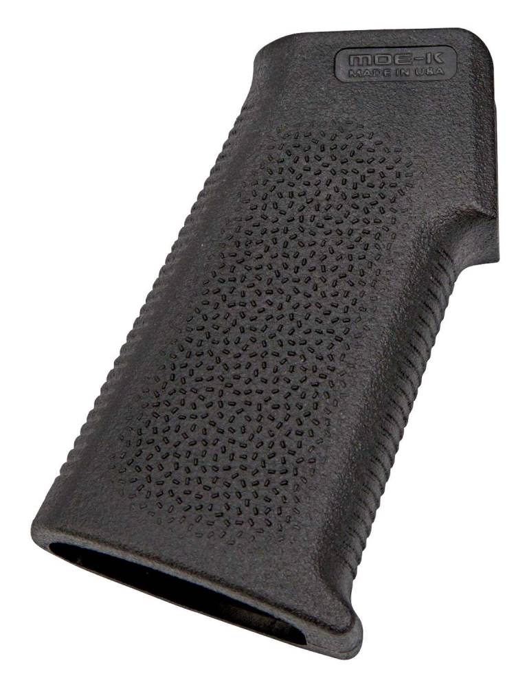 Made in the USA, the MOE-K Grip provides an extremely low profile and compact design with a steeper grip angle compared to more traditional styles. The more vertical grip angle is optimized for use on PDW (Personal Defense Weapon) configurations and improves comfort and control on short LOP rifles that bring the primary hand in closer to the shooter's body. The thin profile and lack of backstrap 'beavertail' also make it an excellent choice for shooters who prefer a smaller grip circumference. All mounting hardware included. NOTE: The MOE K grip will also fit most 7.62 NATO AR10/SR25 style of rifles.