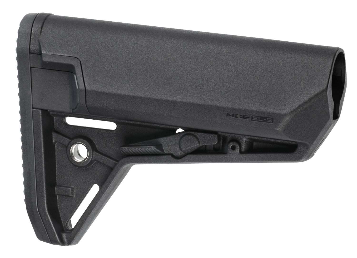 The storage-capable version of the flagship Magpul MOE SL carbine stock, the MOE SL-S (Storage) Stock is a direct replacement buttstock for AR15/M4 carbines. The sleek profile, dual-side release latches, and waterproof battery tubes make it the slimmest storage tube stock available. The SL-S provides an enhanced cheek weld and true, O-ring sealed, 10m waterproof storage area desired by many, but fits it into the narrowest package possible to allow a more upright head position and minimize bulk. A rolled toe and angled rubber butt-pad are optimized for use with body armor, and an ambidextrous QD sling swivel socket is included. A unique leaf-spring tension system provides a solid fit on mil-spec receiver extensions, with slightly less friction than the original SL. The MOE SL-S is the most intuitive, comfortable, and efficient storage stock available.