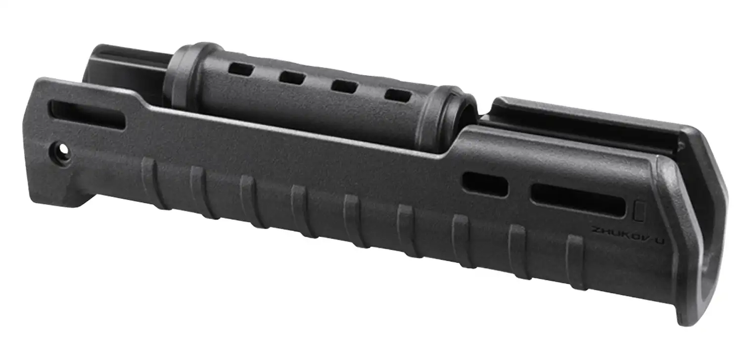 The Zhukov-U Hand Guard shaves off 1.5" from the original Zhukov AK Hand Guard to accommodate shorter barreled rifles and pistols and keeps the front end of full length rifles a little more lively. The shorter version also allows us to accommodate the military issue cleaning rods. The Zhukov-U Hand Guard offers an extended option for modern shooting techniques, polymer outer, aluminum chassis for strength and heat dispersion, a comfortable injection molded exterior for superior ergonomics, extended length provides large gripping surface for modern shooting techniques and M-LOK slots at the three, six and nine o'clock positions for mounting direct-attach M-LOK accessories or M-LOK 1913 Picatinny rail sections. Full length, hard anodized, aluminum chassis clamps directly to barrel and provides for flex-free mounting as well as excellent heat shielding. Includes replacement polymer top cover, compatible with UltiMAK Optics Mount top cover. *Note- The Zhukov-U Hand Guard requires the permanent removal of the factory hand guard retaining cap and forward sling mount if so equipped. Please ensure your barrel diameter under the hand guard falls between 16.75-18.25 millimeters before cutting your retaining cap. Warning- due to extended Hand Guard length, barrels less than 11.5" long are not recommended. Made in USA.