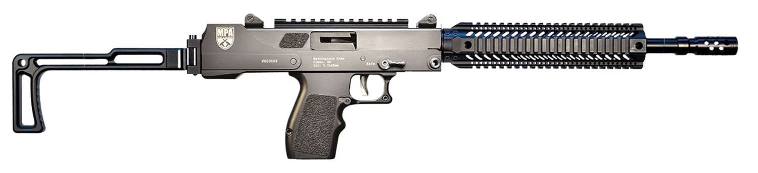 This Defender is a carbine length rifle that is chambered in 5.7x28mm. It features a semi-automatic action with a 16 inch threaded barrel, a muzzle brake, and a 20 round magazine. The Defender is made with a fully machined aluminum frame and grips.