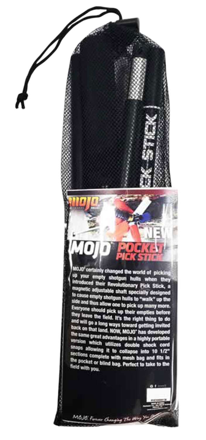 MOJO's Pick Stick is a magnetic adjustable shaft specially designed to cause empty shotgun hulls to "walk" up the side and thus allow one to pick up many more. This highly portable version utilizes double shock cord snaps allowing it to collapse into 10.5" sections complete with mesh bag and fits in the pocket or blind bag. Perfect to take to the field with you.