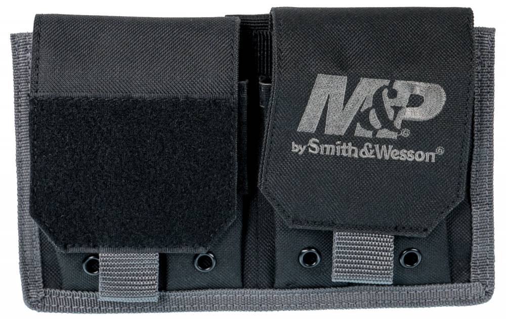 The M&P Pro Tac Mag Pouch features four pistol magazine pouches and holds single or double stock magazines. It is constructed of a durable ballistic fabric with two extra wide fold over flaps with hook and loop closures, and the backside has three MOLLE snap attachments. The external dimensions for this mag pouch are 8.5" x 5.25" x 1.5".